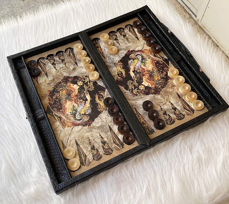 تخته نرد طرح مینیاتوری دارای طراحی های شلوغ و بسیار فاخر است و نقش های اصیل بر روی آن اجرا شده است. این امر را در تصاویر هم به طور واضح می توانید شاهد باشید. بنابراین اگر زیبایی تخته نرد برای شما مهم است، مدل طرح مینیاتوری را از دست ندهید. این وسیله از قسمت بیرون با چرم مصنوعی طرح دار پوشش داده شده است. به همین علت به آن تخته نرد چرم هم گفته می شود.