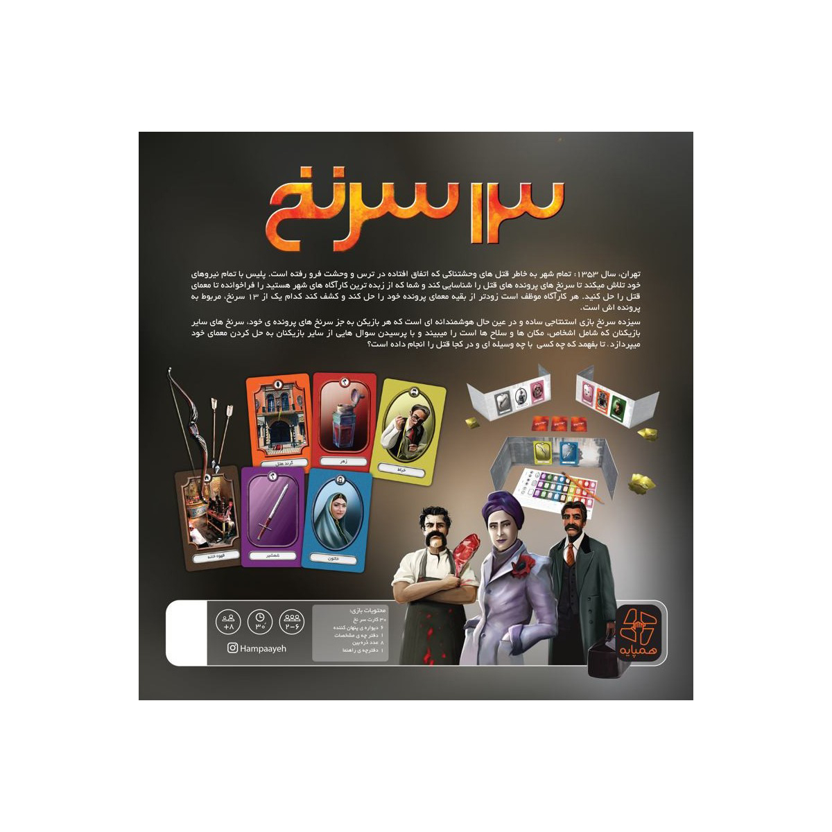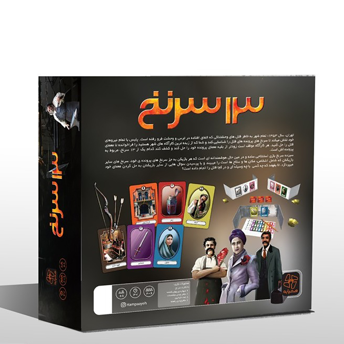 سرنخ یه بازی معمایی و کارآگاهی جذابه که توش باید با استفاده از سرنخها، قاتل رو پیدا کنین! بازیکنان با پرسیدن سوالات مختلف، مظنونین، سلاح و محل وقوع قتل رو بررسی میکنن تا در نهایت پرده از راز این جنایت بردارن. اولین کسی که بتونه جواب درست رو حدس بزنه، برندهی بازیه!