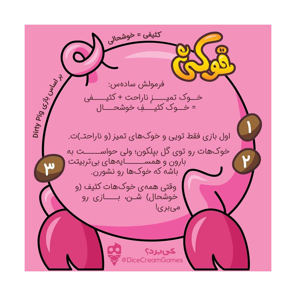 خوکی، یه بازی بامزه و پر از شیطنت که توش باید خوکهای تمیز رو کثیف کنی تا برنده بشی! 🐷💦 توی این بازی، هر بازیکن یه سری خوک داره که دوست دارن کثیف بشن، چون خوکهای کثیف، خوکهای خوشحالی هستن! هدف اینه که زودتر از بقیه، همهی خوکهات رو کثیف کنی و برندهی بازی بشی. 🏆 برای شروع، به هر بازیکن تعدادی کارت خوک داده میشه که باید به طرف تمیزشون بچینیش. بعد، کارتهای عمل رو بین بازیکنا تقسیم میکنن و بازی شروع میشه. هر بازیکن توی نوبتش یه کارت بازی میکنه و سعی میکنه خوکهاش رو کثیف کنه. کارتهای مختلفی مثل “تو گل پلکیدن” برای کثیف کردن خوکها، “بارون” برای تمیز کردن خوکها، “اصطبل” برای محافظت از خوکها و “صاعقه” برای نابود کردن اصطبلها وجود دارن. باید حسابی زرنگ باشی و از کارتها درست استفاده کنی تا خوکهات رو از شر بارون و صاعقه در امان نگه داری! 🌧️⚡ این بازی برای ۲ تا ۶ نفر مناسبه و هر دورش پر از لحظات خندهدار و هیجانانگیزه. آمادهای خوکهات رو کثیف کنی و برندهی بازی بشی؟ 😄🐖