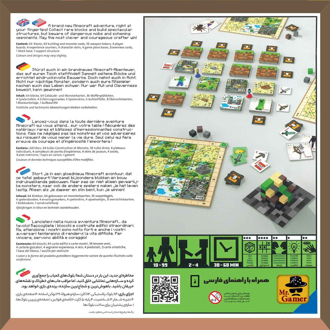 تو این بازی، شما وارد دنیای ماین‌کرفت می‌شید و باید با کاوش در زیستگاه‌های مختلف، بلوک‌ها رو جمع‌آوری کنید و سازه‌های تماشایی بسازید. 🏗️🌲 هدف اینه که با برنامه‌ریزی دقیق و دفاع در برابر ماب‌ها (هیولاها)، بیشترین امتیاز رو کسب کنید و برنده بازی بشید. هر بازیکن در نوبت خود می‌تونه دو عملیات انجام بده، مثل جمع‌آوری بلوک‌ها، کاوش در دنیای ماورایی، ساخت سازه‌ها یا جنگیدن با ماب‌ها. باید با دقت بلوک‌ها رو انتخاب کنی و سازه‌ها رو طوری بسازی که بیشترین امتیاز رو بهت بده. بازی سه فاز امتیازگیری داره که در پایان هر فاز، امتیازها محاسبه می‌شن. بازیکنی که در پایان فاز سوم بیشترین امتیاز رو داشته باشه، برنده بازی میشه. این بازی پر از استراتژی و لحظات هیجان‌انگیزه. باید همیشه حواست به حرکت‌های رقیبات باشه و بهترین تصمیم‌ها رو بگیری تا بتونی برنده بازی بشی!