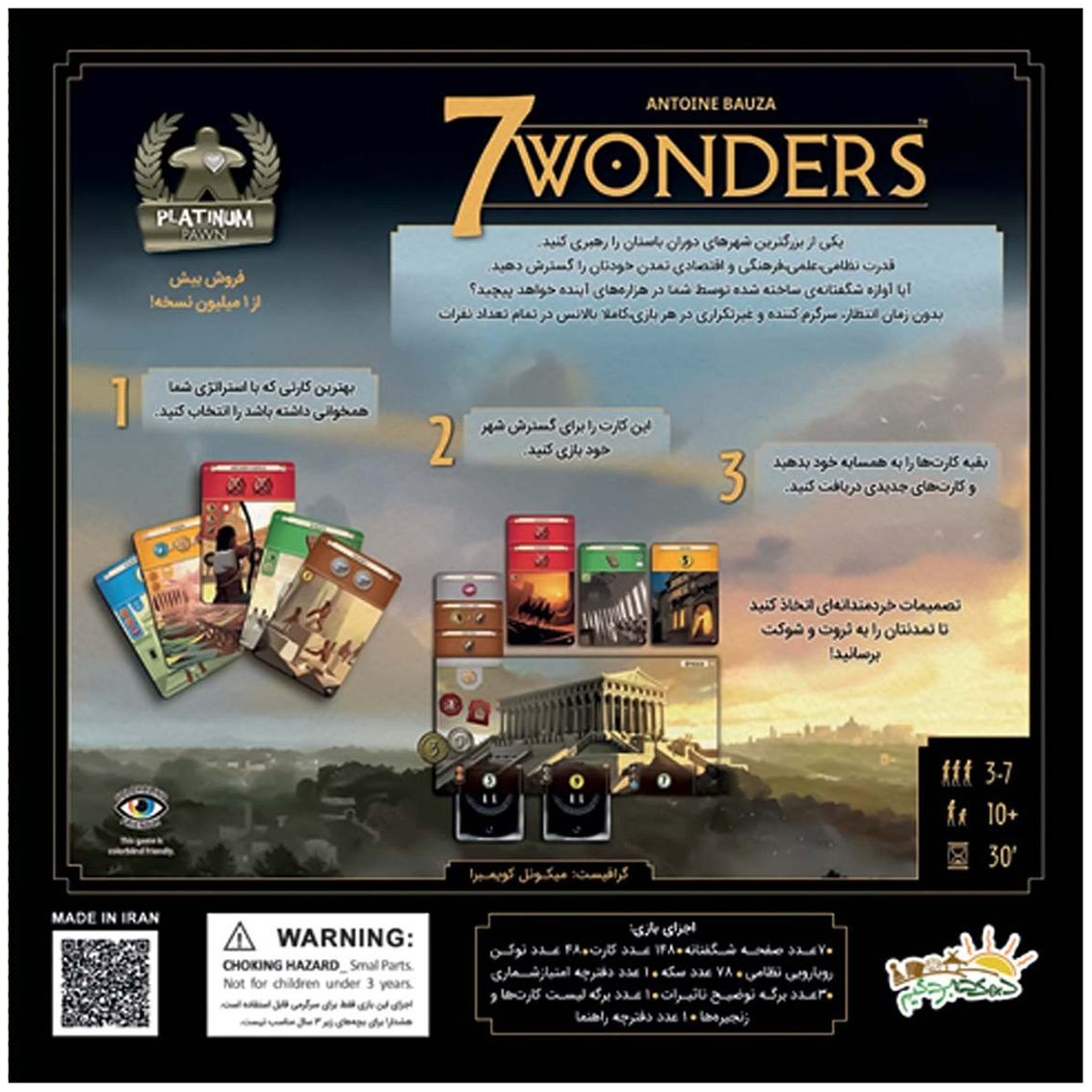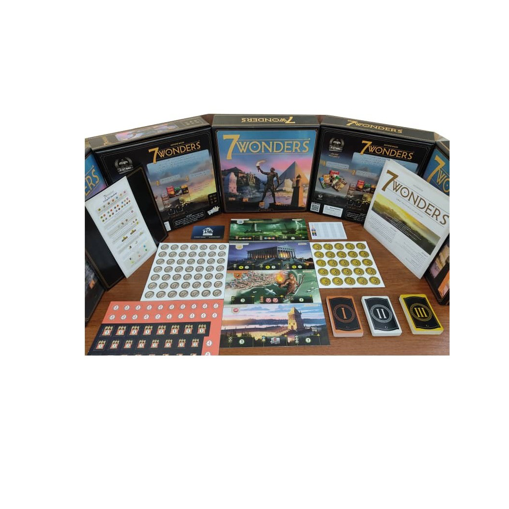 🏛️ عجایب هفتگانه (نسخه دوم – 2020): تمدن بساز، شکوه بیافرین! 🏗️📜⚔️ در بازی کارتیِ تحسینشدهی Seven Wonders (Second Edition)، شما در نقش رهبر یکی از ۷ شهر بزرگ دنیای باستان قرار میگیرید. باید منابع سرزمینتان را استخراج کرده، با هوشمندی سازههای گوناگون بسازید، قدرت نظامی خود را ارتقا دهید و مسیرهای تجاریتان را گسترش دهید. در پایان، با ساخت یکی از عجایب شگفتانگیز دنیا، میراثی جاودانه بر جای بگذارید! 🕰️ بازی در سه “عصر” (Age) انجام میشود. در ابتدای هر عصر، بازیکنان هفت کارت دریافت میکنند. هر نوبت، یکی را انتخاب و بازی میکنند و بقیه را به بازیکن کنار دستی میدهند. این روند تکرار میشود تا تمام کارتهای آن عصر بازی شوند. در هر نوبت، شما تصمیم میگیرید: منبع تولید کنید؟ ساختمان تجاری بسازید؟ ارتشتان را تقویت کنید؟ یا قدمی برای ساخت عجایبتان بردارید؟ ✨ کارتها برخی بلافاصله اثر میگذارند، برخی تا پایان بازی امتیاز میآورند. همه چیز بستگی به استراتژی شما دارد! 🔍 با انتخاب درست، شهر شما به یک تمدن باشکوه تبدیل میشود. پس از پایان عصر سوم، با جمع امتیاز ساختمانها، عجایب، دانش، جنگها و سکهها، پیروز بازی مشخص میشود.