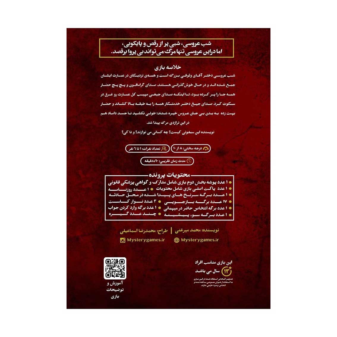 شب عروسیه، همه خوشحالن، موسیقی پخش می‌شه، اما یه اتفاق وحشتناک این جشن رو به عزا تبدیل می‌کنه! صدای جیغ خدمتکار، مهمونا رو به طبقه بالا می‌کشونه، جایی که عروس بی‌جون افتاده… و چند لحظه بعد جسد داماد هم پیدا می‌شه! حالا سوال اینه: کی این شب خوشی رو به یه کابوس تبدیل کرده؟ چی تو این مهمونی داره رخ می‌ده؟ معما رو حل کن و قاتل رو پیدا کن!