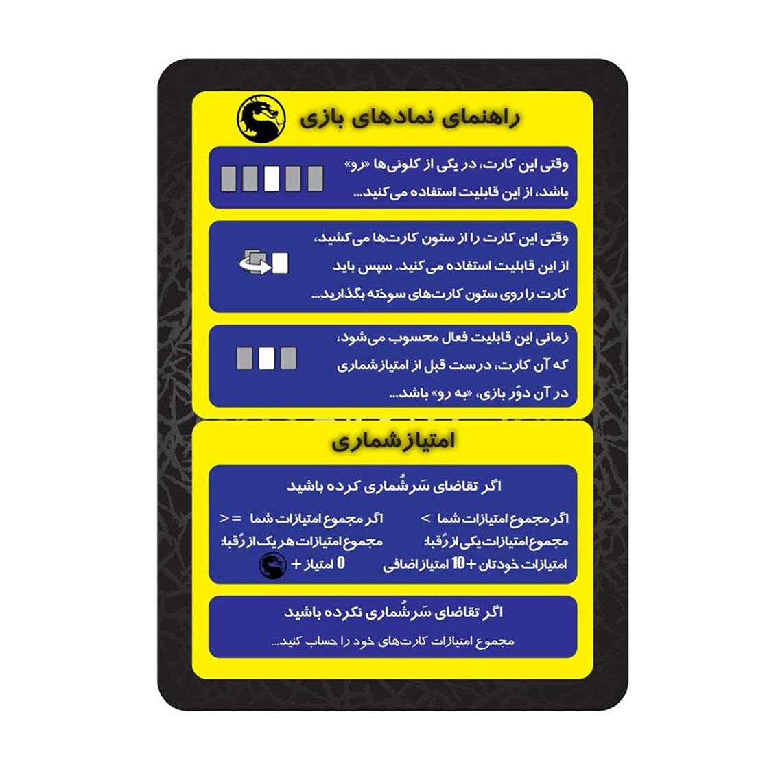 تو این بازی، شما یه نگهبان قلمروی مخفی هستید که باید از «کرههای آتشین» قدرتمند در برابر ارتش تاریکیهای شائو کان محافظت کنید! 🔥🗡️ هر بازیکن یکی از قهرمانان مورتال کامبت رو هدایت میکنه و باید با استفاده از مهارتهای منحصربهفردش، تاریکیها رو از قلمرو خودش دور کنه. هدف اینه که کمترین تعداد تاریکیها رو در قلمرو خودت داشته باشی و جلوی دسترسی شائو کان به کرههای آتشین رو بگیری. بازی پر از نبردهای استراتژیکه و باید با دقت حرکتها رو برنامهریزی کنی. هر قهرمان قدرتهای خاص خودش رو داره و میتونه با استفاده از اونها، تاریکیها رو شکست بده. در پایان بازی، اگه کمترین تاریکیها رو در قلمرو خودت داشته باشی، برندهی نبرد میشی و میتونی از قدرتهای نهایی مورتال کامبت استفاده کنی! 💥 این بازی هم به صورت مستقل و هم به صورت ترکیبی با نسخههای دیگهاش قابل بازیه. نسخههای بعدی هم در راه هستن که میتونن تجربه بازی رو حتی جذابتر کنن!
