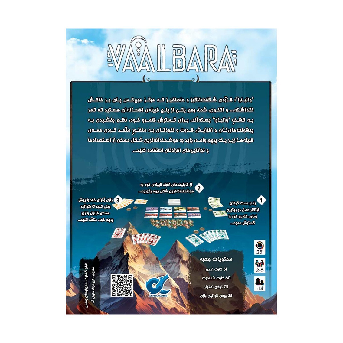 تو این بازی، شما رهبر یکی از پنج قبیله‌ی افسانه‌ای هستید که به دنبال کشف و تسخیر قاره‌ی شگفت‌انگیز “والبارا” هستید. 🌍🏞️ هدف اینه که با گسترش قلمرو، استفاده از قابلیت‌های افراد قبیله و پیش‌بینی حرکت‌های رقیباتون، بیشترین امتیاز رو به دست بیارید و برنده‌ی بازی بشید. هر بازیکن باید با دقت و استراتژی، کارت‌های زمین و شخصیت‌ها رو مدیریت کنه و از نشانه‌های قبیله‌شون به بهترین شکل استفاده کنه. بازی بعد از ۹ دور تموم می‌شه و بازیکنی که بیشترین امتیاز رو داشته باشه، برنده‌ی بازی میشه. این بازی پر از استراتژی و لحظات هیجان‌انگیزه. باید همیشه حواستون به حرکت‌های رقیباتون باشه و از فرصت‌ها نهایت استفاده رو ببرید تا برنده‌ی بازی بشید!