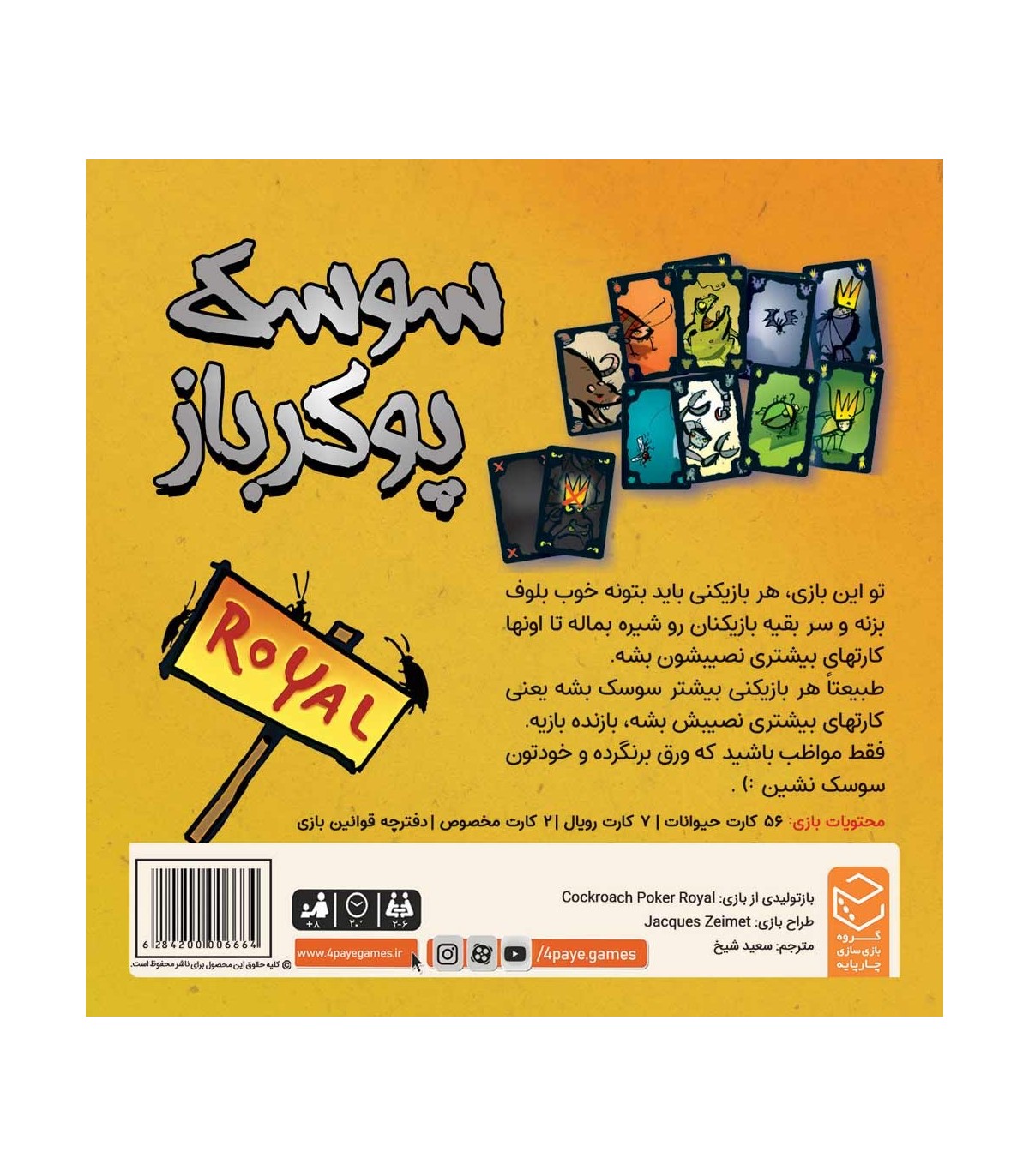 سوسک پوکر رویال، یه بازی کارتی پر از فریب و بلوفه که باید حسابی زرنگ باشی تا بازنده نشی! 🃏🪳 توی این بازی، هر بازیکن باید سعی کنه کارت‌ها رو به بقیه تحمیل کنه و اون‌ها رو مجبور کنه کارت‌های بیشتری جمع کنن. هر کی بیشتر کارت جمع کنه، بازنده‌ی بازیه! پس هدف اینه که با بلوف زدن و زرنگی، بقیه رو گیر بندازی و خودت کمتر کارت جمع کنی. 😏🔥 برای شروع بازی، کارت‌ها رو خوب بُر می‌زنیم و به هر بازیکن به طور مساوی کارت می‌دیم. یه دسته کارت ویژه هم وسط میز قرار می‌گیره که کارت بالاش رو می‌کنیم. بازی با جوان‌ترین بازیکن شروع می‌شه و اون باید یه کارت از دستش رو به پشت به بازیکن دیگه بده و یه ادعا بکنه. مثلاً می‌تونه بگه: “این کارت یه سوسکه!” یا “این کارت یه قورباغه‌ست!” 🐸🪳 بازیکنی که کارت رو دریافت می‌کنه، دو تا انتخاب داره: یا ادعای طرف رو باور کنه و کارت رو نگه داره، یا شک کنه و کارت رو برگردونه. اگه ادعا درست باشه، کارت برای خودِ بازیکنه و اگه اشتباه باشه، کارت برای کسیه که ادعا کرده. اینجوری بازی ادامه پیدا می‌کنه تا یه بازیکن مجبور بشه چهار کارت از یه نوع حیوان جمع کنه و بازنده بشه! 😱🎴 این بازی پر از لحظات خنده‌دار و تنش‌انگیزه، چون هرکی می‌تونه با یه بلوف ماهرانه، بازی رو به نفع خودش تغییر بده. آماده‌ای زرنگ باشی و بقیه رو گیر بندازی؟ 😎🃏