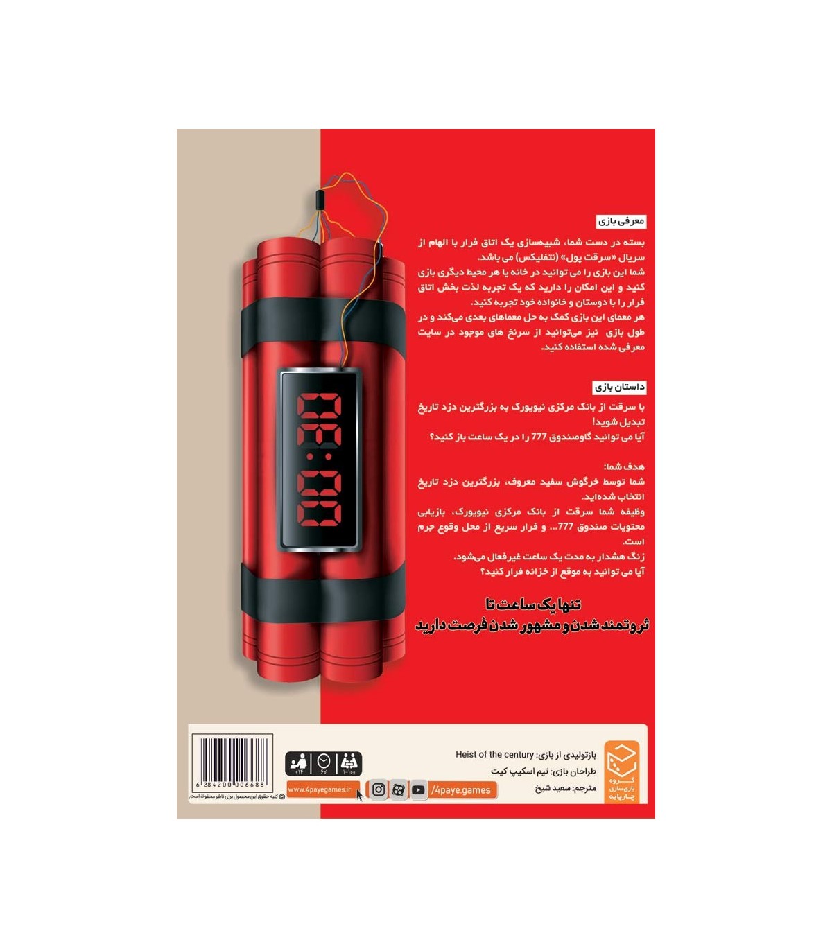 یه اتاق فرار خفن با الهام از سریال سرقت پول توی خونتون راه بندازید و با دوستاتون تجربهی یه دزدی پرهیجان رو داشته باشید! شما توسط خرگوش سفید، بزرگترین دزد تاریخ، انتخاب شدین تا از بانک مرکزی نیویورک سرقت کنید و محتوای مرموز صندوق 777 رو بدزدید. اما وقت کمه—زنگ هشدار فقط یک ساعت خاموشه! با حل کردن معماها، قدم به قدم به هدف نزدیکتر میشید و اگه بتونید قبل از تموم شدن تایمر فرار کنید، به بزرگترین دزد تاریخ تبدیل میشید! آی