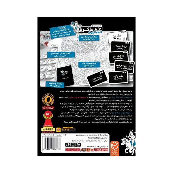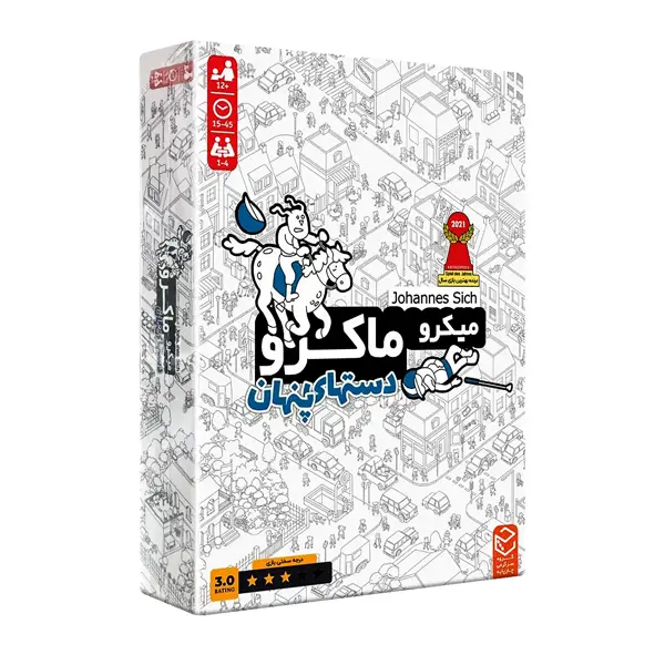 به شهر جنایت خوش آمدید، جایی که هر گوشهاش پر از داستانهای مرموز و جنایتهای پیچیدهست. دزدیهای یواشکی، قتلهای خونسرد و اسرار مرگبار، همهچیز اینجاست و شما باید این پروندهها رو حل کنید! میکرو ماکرو ۳ سومین قسمت از مجموعهی محبوب میکرو ماکرو: شهر جنایته. این بازی یه نقشهی جدید با ۱۶ پروندهی جنایی داره که منتظرن تا شما اونها رو حل کنید. برخلاف قسمتهای قبلی، این بازی کاملاً مستقلست و نیازی به قسمتهای اول و دوم نداره. تو این بازی، شما نقش یه کارآگاه رو بازی میکنید. باید با دقت به نقشهی غولپیکر شهر (۷۰ در ۱۰۰ سانتیمتر) نگاه کنید، سرنخها رو پیدا کنید، ردپاها رو دنبال کنید و مجرمان رو شناسایی کنید. هر پرونده شامل کارتهاییست که از شما میخوان چیزی رو روی نقشه پیدا کنید یا مسیر حرکت مظنونها رو کشف کنید. یه چشم تیزبین و یه ذهن هوشمند، کلید موفقیت شماست!