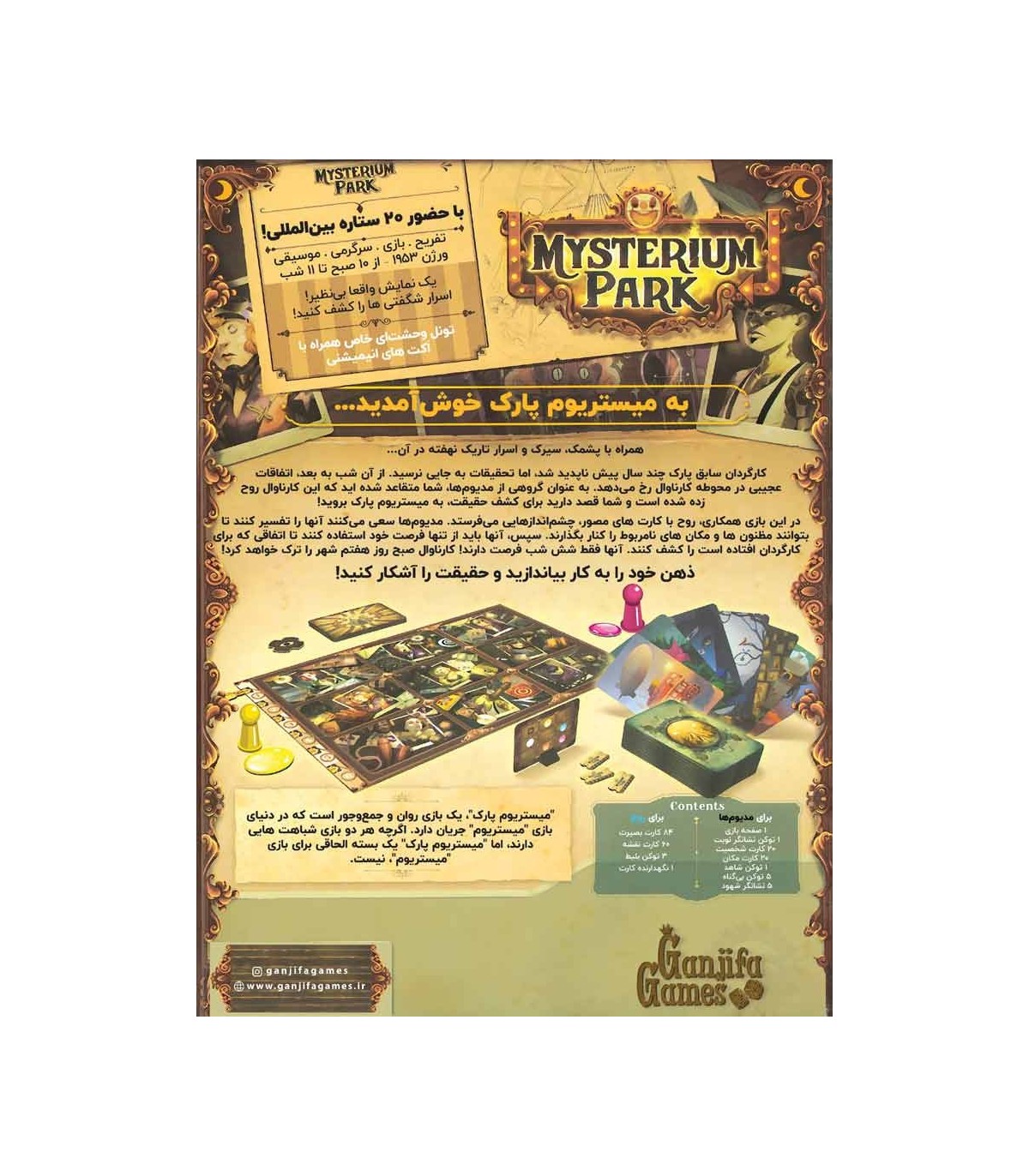 میستریوم پارک، یه بازی معمایی و همکاریه که توش باید با همکاری دوستات، راز مرگ کارگردان پارک ناشناخته‌ها رو کشف کنی! 👻🎪 توی این بازی، شما و دوستات به عنوان مدیوم‌ها وارد پارک می‌شین و با کمک روح کارگردان، سرنخ‌ها رو جمع‌آوری می‌کنین تا معما رو حل کنین. اما مواظب باشین، چون روح فقط می‌تونه با کارت‌های بصیرت با شما ارتباط برقرار کنه و باید با دقت این سرنخ‌ها رو تفسیر کنین! 😱 هر بازیکن توی تیم باید یه مظنون رو تبرئه کنه و یه مکان رو حذف کنه. این مأموریت شخصیه هر کدوم از شماست. اما برای حل معما، باید با همفکری و همکاری، کارت‌های بصیرت رو تفسیر کنین و به جواب درست برسین. هدف اینه که قبل از تموم شدن زمان، راز مرگ کارگردان رو کشف کنین و روحش رو از عذاب نجات بدین! 🏆✨ این بازی برای ۲ تا 6 نفر مناسبه و هر دورش پر از لحظات هیجان‌انگیز و چالش‌برانگیزه. آماده‌ای با زرنگی و کمی شانس، معما رو حل کنی و برنده‌ی بازی بشی؟ 😎🔥
