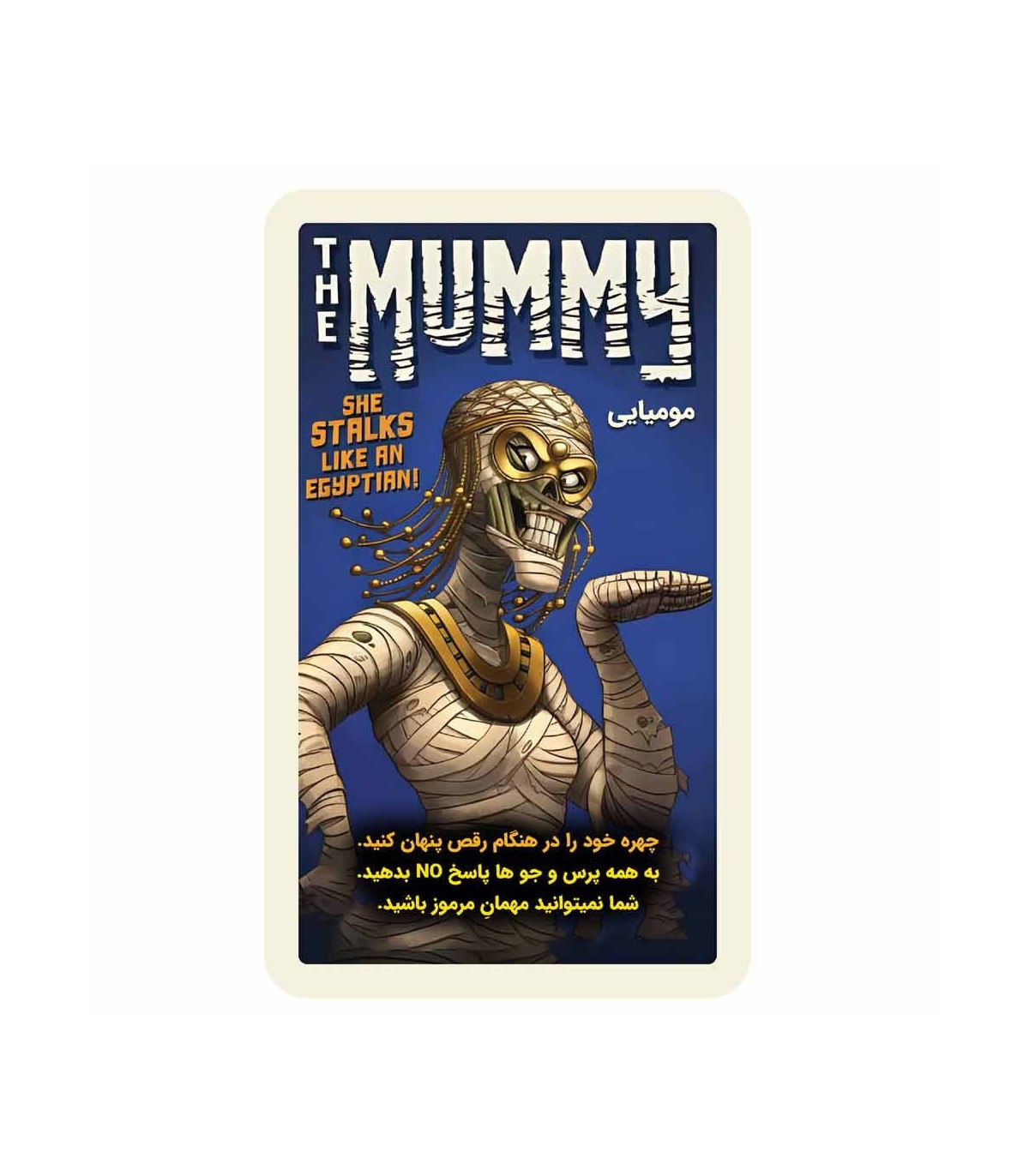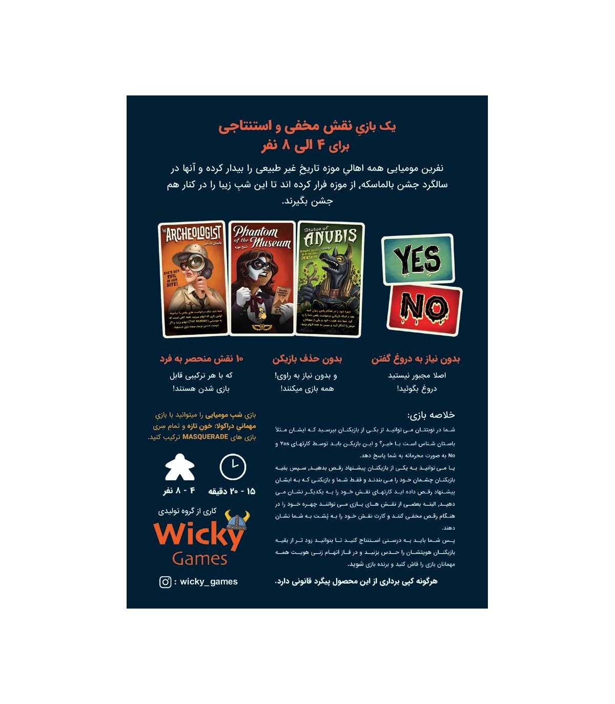 تو این بازی، شما وارد یه مهمانی مرموز و هیجان‌انگیز می‌شید که در اون مومیایی‌ها و موجودات عجیب و غریب از موزه فرار کردن تا جشن بگیرن! 🎭🧛‍♂️ هدف اینه که با پرسیدن سوال‌های هوشمندانه و تحلیل رفتار بقیه بازیکن‌ها، هویت اون‌ها رو حدس بزنی و اولین نفری باشی که همه‌ی نقش‌ها رو فاش می‌کنه. هر بازیکن یه نقش مخفی داره که قابلیت‌های منحصربه‌فردی بهش میده. بعضی‌ها حتی راه‌های اضافی برای برنده شدن دارن! باید با دقت و استراتژی، سوال‌ها رو بپرسی و از قابلیت‌های نقش خودت نهایت استفاده رو ببری تا برنده‌ی بازی بشی. این بازی پر از لحظات هیجان‌انگیز و استراتژیکه و حتی می‌تونی اون رو با بازی “مهمانی دراکولا: خون تازه” ترکیب کنی تا تجربه‌ی بازی‌ات رو جذاب‌تر کنی. اگه دوست داری یه بازی نقش‌محور پر از حدس و گمان رو تجربه کنی، این بازی قطعاً برات جذابه!