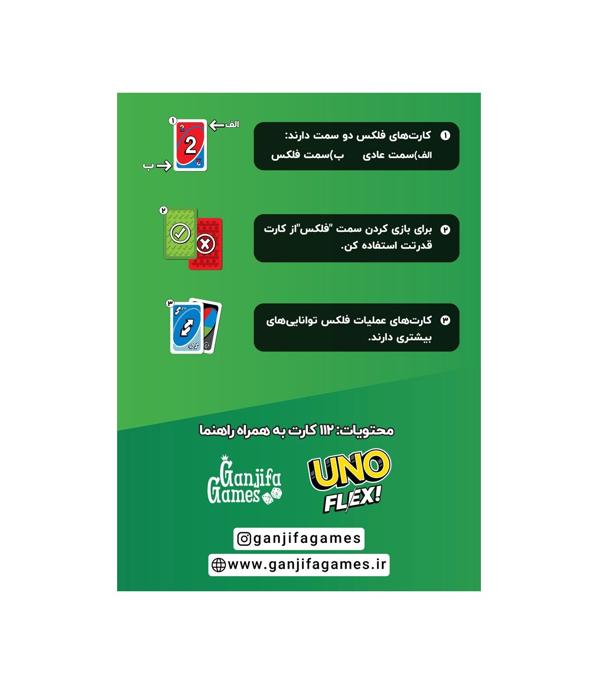اونو فلکس، یه نسخه هیجانانگیز و متفاوت از بازی کلاسیک اونو هست که با کارتهای “فلکس” و “قدرت” بازی رو حسابی جذابتر کرده! 🃏✨ توی این بازی، مثل همیشه باید کارتهات رو با تطبیق رنگ، عدد یا نماد بازی کنی، اما این بار یه ویژگی خاص اضافه شده: کارتهای فلکس! این کارتها دو طرف دارن و میتونن رنگشون رو تغییر بدن تا بتونی بهتر با کارتهای روی میز تطبیق بدی. 😎🔥 هر بازیکن یه کارت قدرت داره که تعیین میکنه میتونی از سمت فلکس کارتها استفاده کنی یا نه. اگه کارت قدرتت روی سبز باشه، میتونی از سمت فلکس کارتها استفاده کنی، اما اگه روی قرمز باشه، این امکان رو نداری. بعد از هر بار استفاده از سمت فلکس، کارت قدرتت به قرمز تغییر میکنه و تا زمانی که همه کارتهای قدرت قرمز نشدن یا یه کارت “چرخش” بازی نکنی، نمیتونی دوباره از سمت فلکس استفاده کنی. 🔄 این بازی برای ۲ تا ۱۰ نفر مناسبه و هر دورش پر از لحظات استراتژیک و هیجانانگیزه. آمادهای با زرنگی و کمی شانس، برندهی بازی بشی و با گفتن “اونو!” همه رو شگفتزده کنی؟ 😄🎴