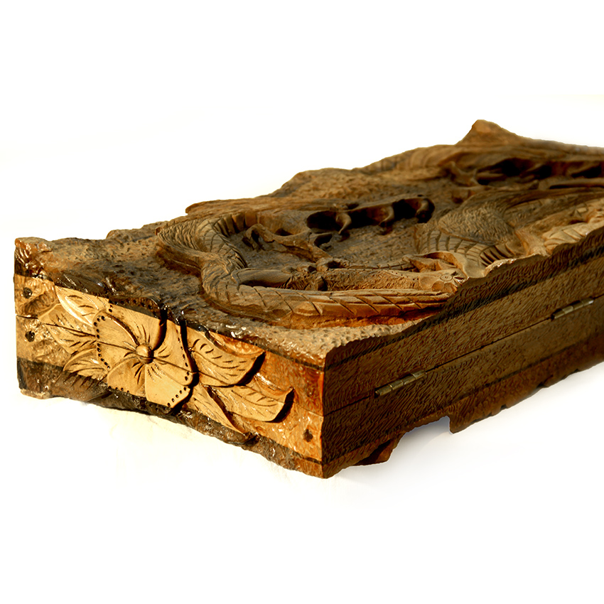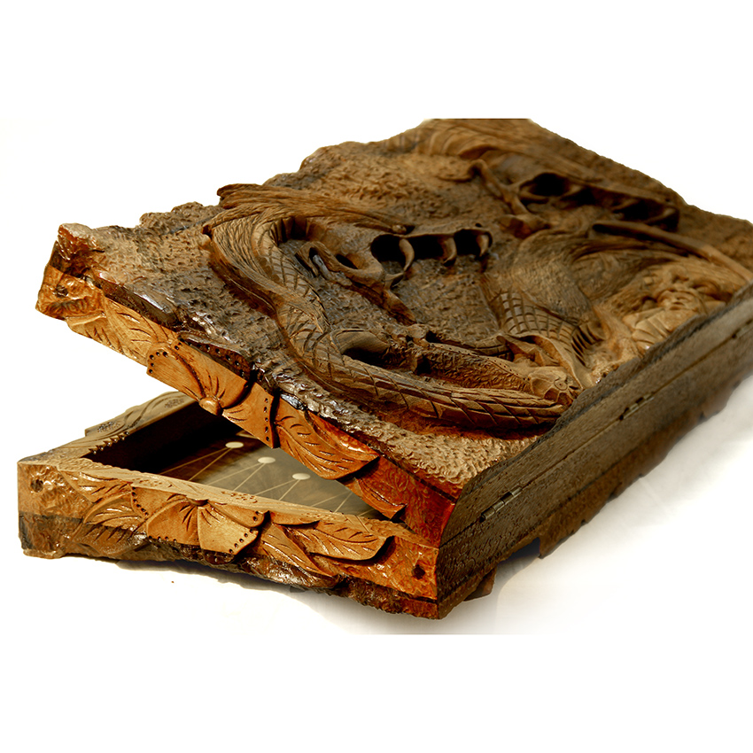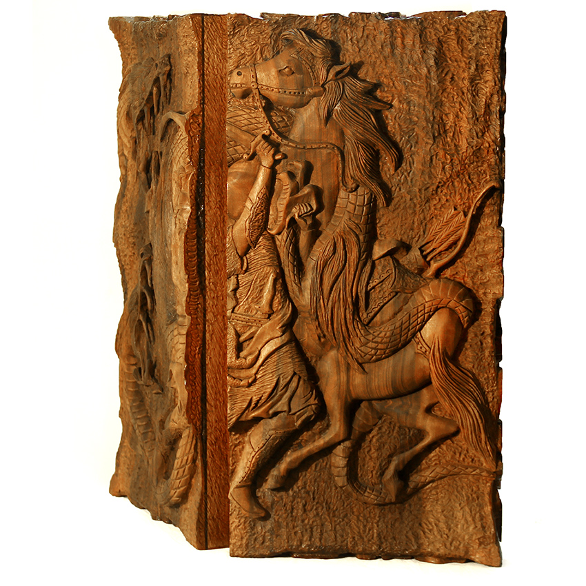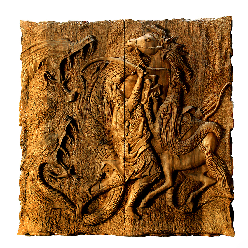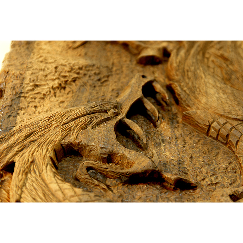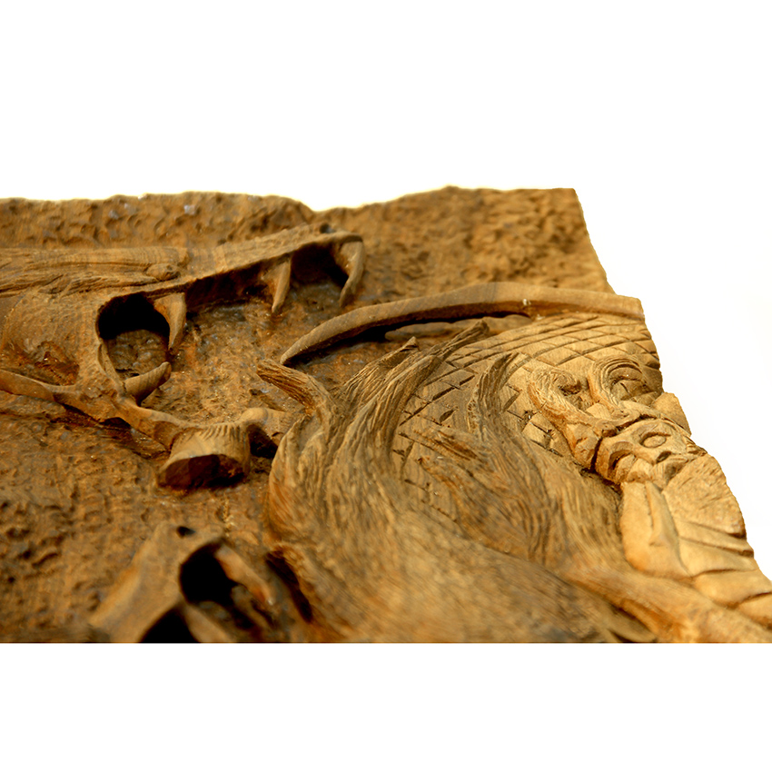 نقش برجسته و دقیق نبرد رستم و اژدها به صورت هنرمندانه بر روی تخته حک شده است،